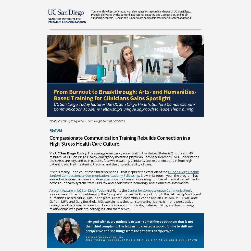 A recent feature in UC San Diego Today highlights the Center for Compassionate Communication’s innovative approach to addressing the "compassion crisis" in America through the Fellowship's arts- and humanities-based curriculum. In the piece, Center leadership, Evonne Kaplan-Liss, MD, MPH, Val Lantz-Gefroh, MFA, and Gary Buckholz, MD, explain how theater, storytelling, journalism, and perspective-taking have the power to transform how clinicians communicate, foster empathy, and build stronger relationships with patients, colleagues, and themselves.