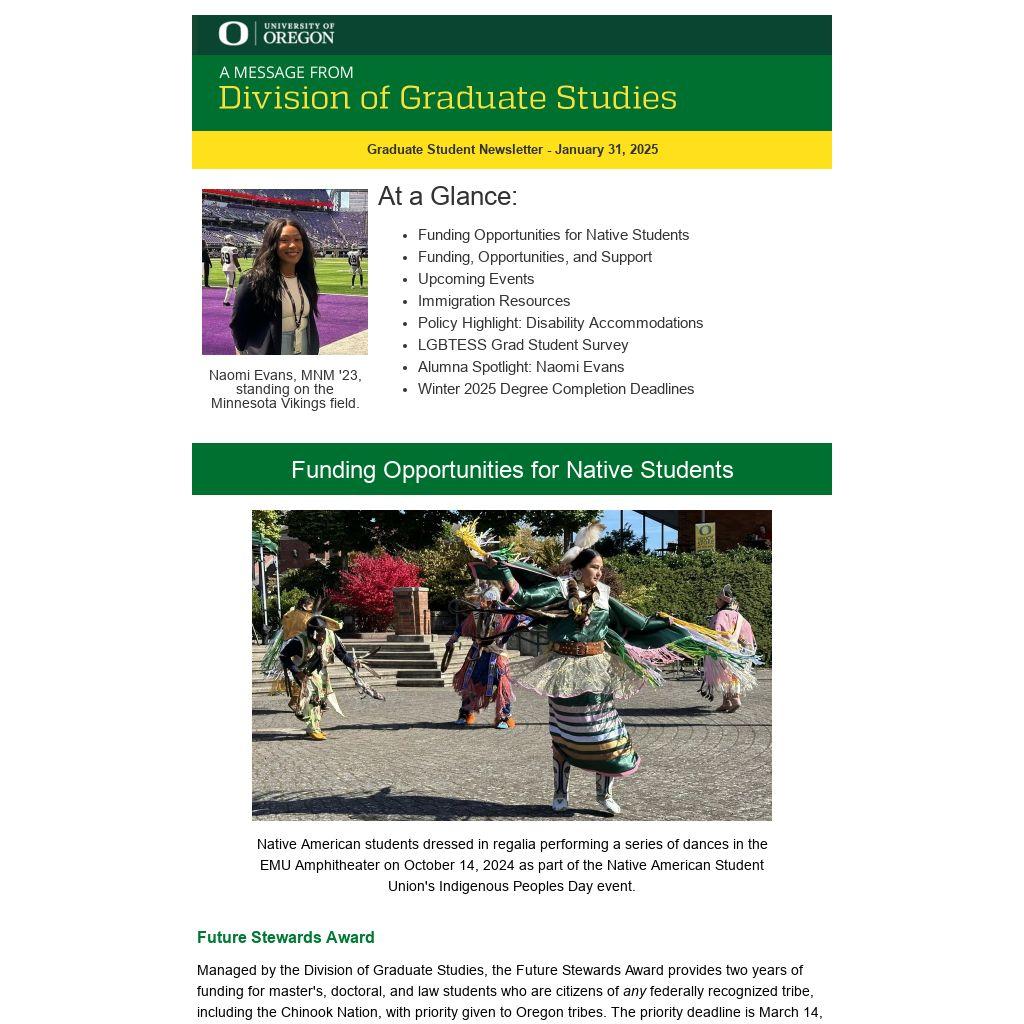 Managed by the Division of Graduate Studies, the Future Stewards Award provides two years of funding for master's, doctoral, and law students who are citizens of any federally recognized tribe, including the Chinook Nation, with priority given to Oregon tribes. The priority deadline is March 14, 2025, and applications are accepted through July 31, 2025.