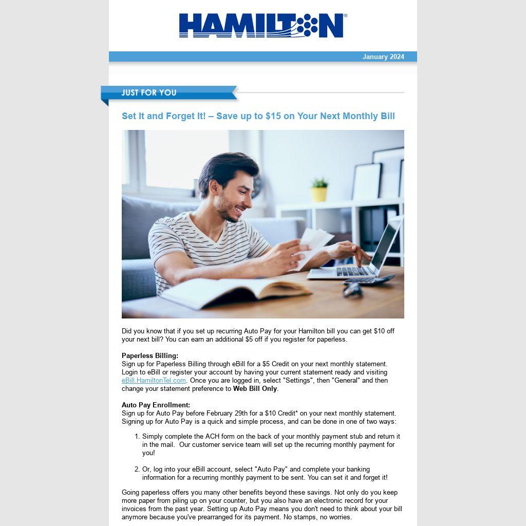 Did you know that if you set up recurring Auto Pay for your Hamilton bill you can get $10 off your next bill? You can earn an additional $5 off if you register for paperless. Paperless Billing: Sign up for Paperless Billing through eBill for a $5 Credit on your next monthly statement. Login to eBill or register your account by having your current statement ready and visiting eBill.HamiltonTel.com. Once you are logged in, select "Settings", then "General" and then change your statement preference to Web Bill Only. Auto Pay Enrollment: Sign up for Auto Pay before February 29th for a $10 Credit* on your next monthly statement. Signing up for Auto Pay is a quick and simple process, and can be done in one of two ways: