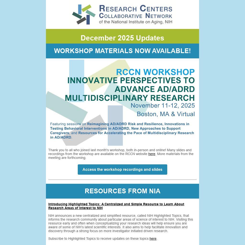 Interested in learning more about any of the NIA centers programs? Looking for more detailed information on pilot funding, webinars, resources and more? Visit the websites below. |