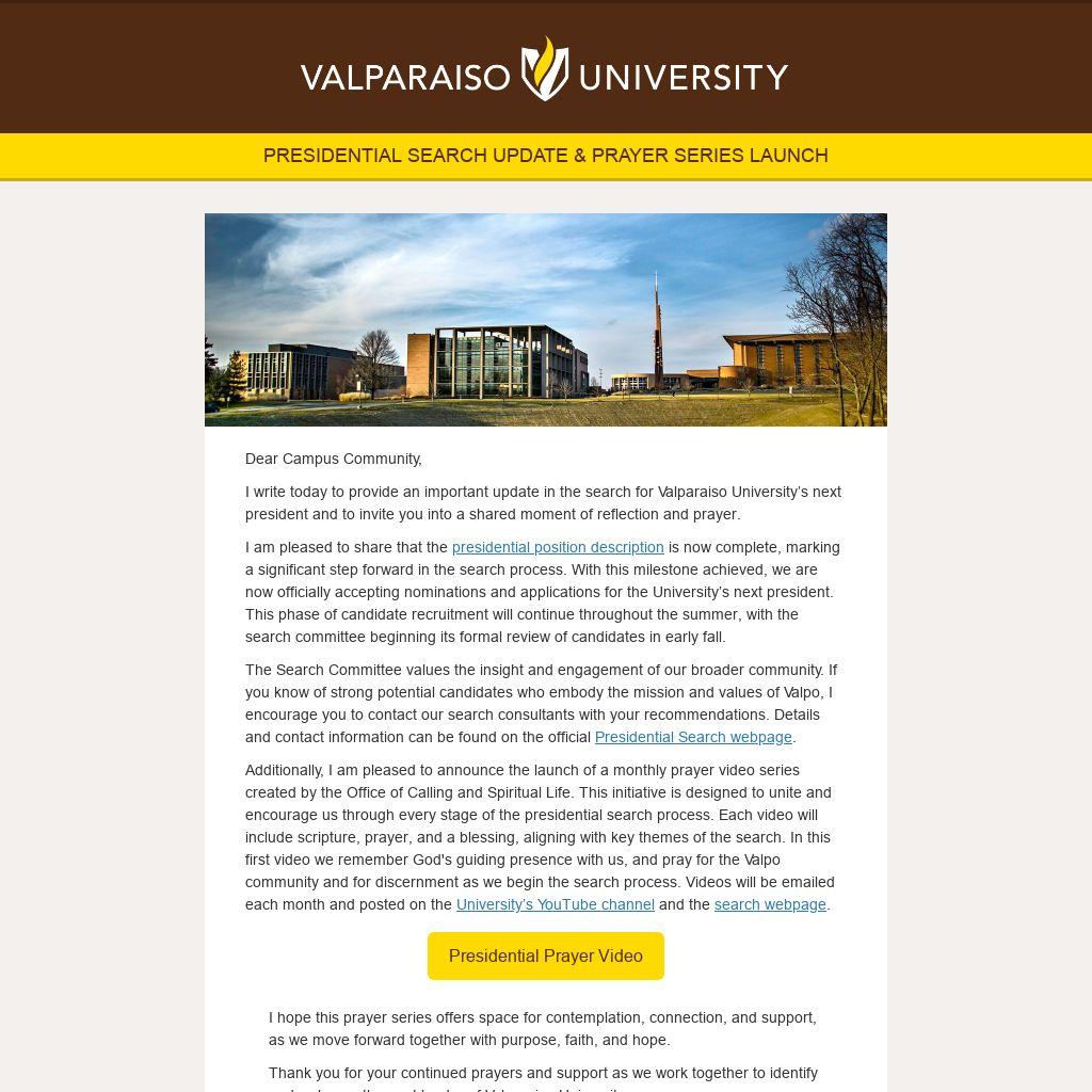 Thank you for your continued prayers and support as we work together to identify and welcome the next leader of Valparaiso University.