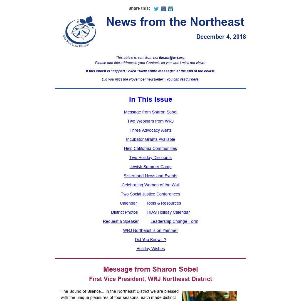 Share this newsletter by using one of the "Share this" icons at the top of the newsletter. The next eblast will be sent on January 1, 2019.