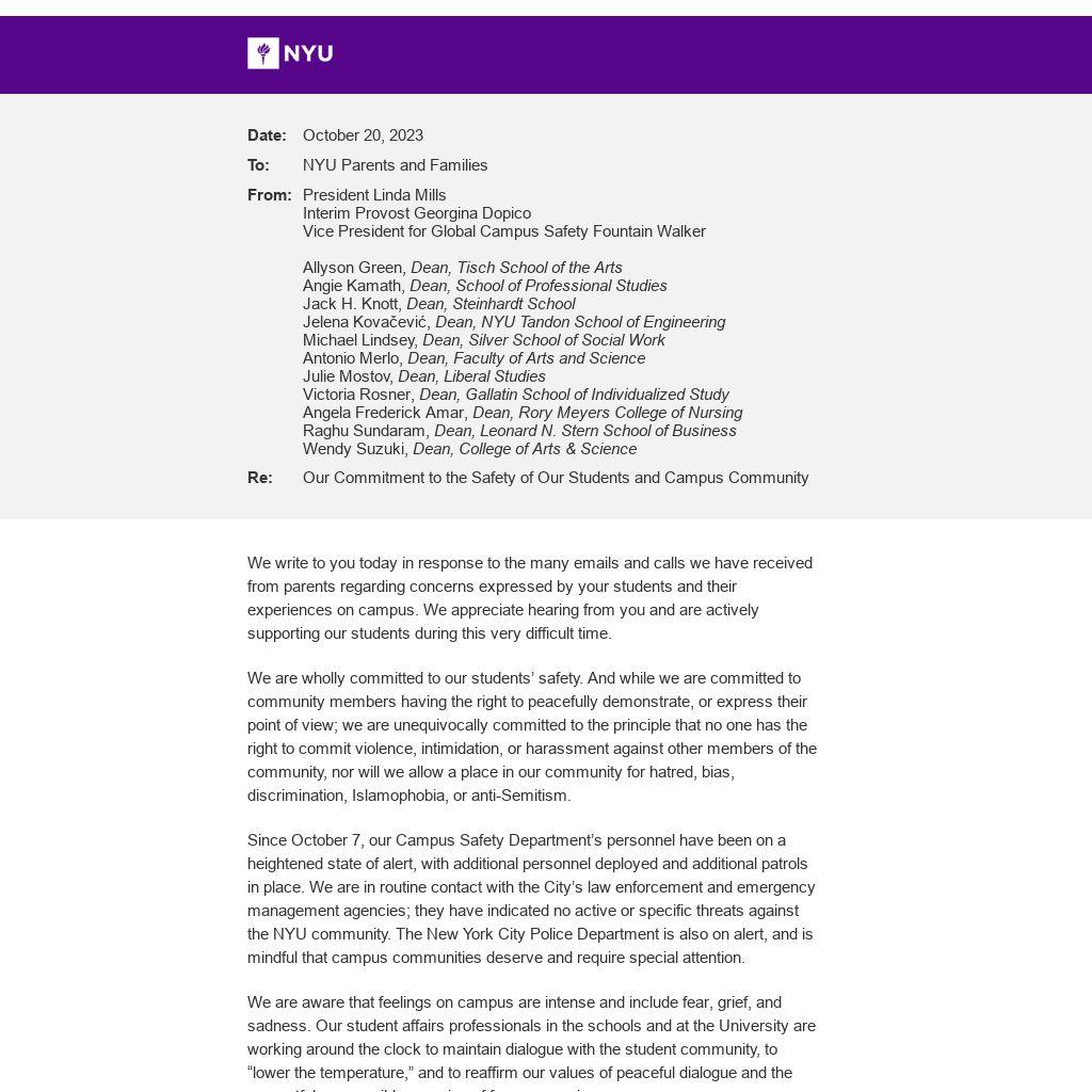 We know the trust you place in us by sending your students to be educated here; we take it extraordinarily seriously. If you have any questions, please email the Office of the Dean of Students at parents@nyu.edu.