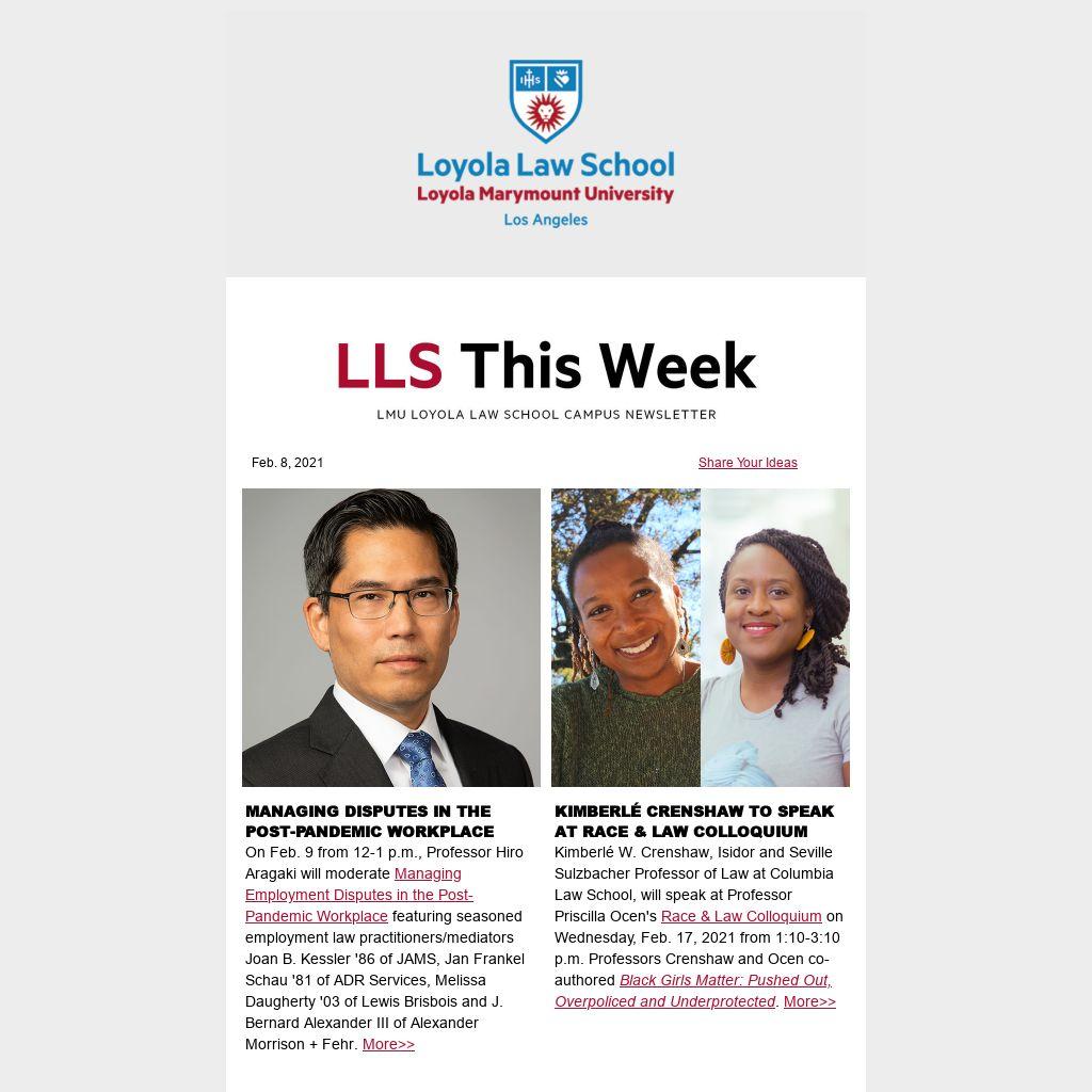 The Strategic Planning Steering Committee has unveiled an interactive website to present a draft of the university’s proposed strategic plan, “Creating the World We Want to Live In: LMU, 2021-26.” The draft, which emerged from an in-depth consultative process, is introduced by a brief video and includes a survey for community feedback. Responses to the survey are requested by Friday, Feb. 12, 2021. Read More>>