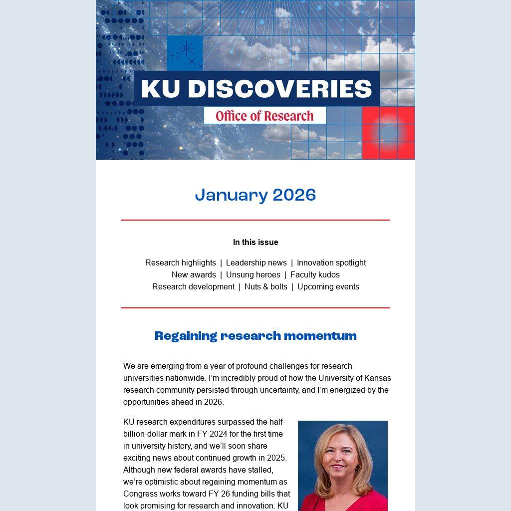 We are emerging from a year of profound challenges for research universities nationwide. I’m incredibly proud of how the University of Kansas research community persisted through uncertainty, and I’m energized by the opportunities ahead in 2026.