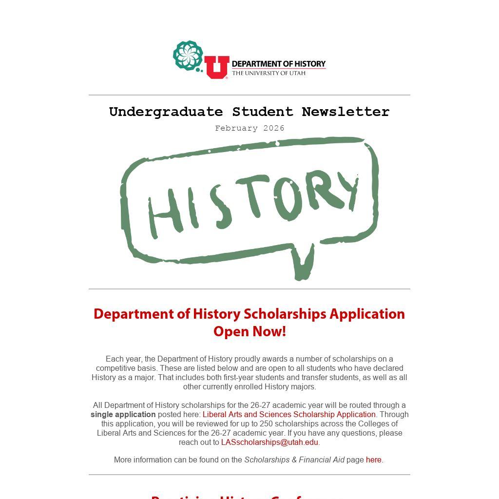 All Department of History scholarships for the 26-27 academic year will be routed through a single application posted here: Liberal Arts and Sciences Scholarship Application. Through this application, you will be reviewed for up to 250 scholarships across the Colleges of Liberal Arts and Sciences for the 26-27 academic year. If you have any questions, please reach out to LASscholarships@utah.edu.