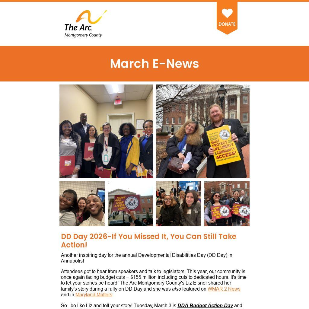 Attendees got to hear from speakers and talk to legislators. This year, our community is once again facing budget cuts -- $155 million including cuts to dedicated hours. It's time to let your stories be heard! The Arc Montgomery County's Liz Eisner shared her family's story during a rally on DD Day and she was also featured on WMAR 2 News and in Maryland Matters.