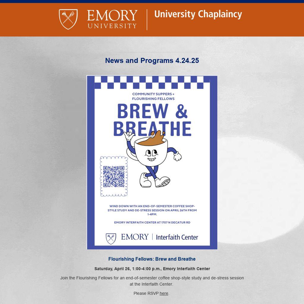 Emory University Chaplaincy ENews is published weekly during term publicizing Atlanta-campus spiritual life programs. It is not a comprehensive listing. For Oxford College spiritual life, please click here. To submit information or to update your preferences, please contact religiouslife@emory.edu.