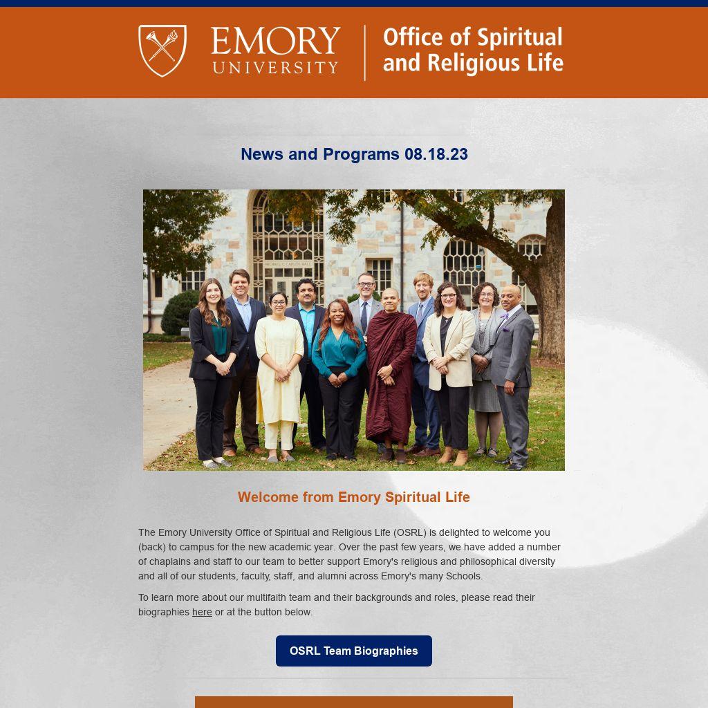 The Emory University Office of Spiritual and Religious Life (OSRL) is delighted to welcome you (back) to campus for the new academic year. Over the past few years, we have added a number of chaplains and staff to our team to better support Emory's religious and philosophical diversity and all of our students, faculty, staff, and alumni across Emory's many Schools.