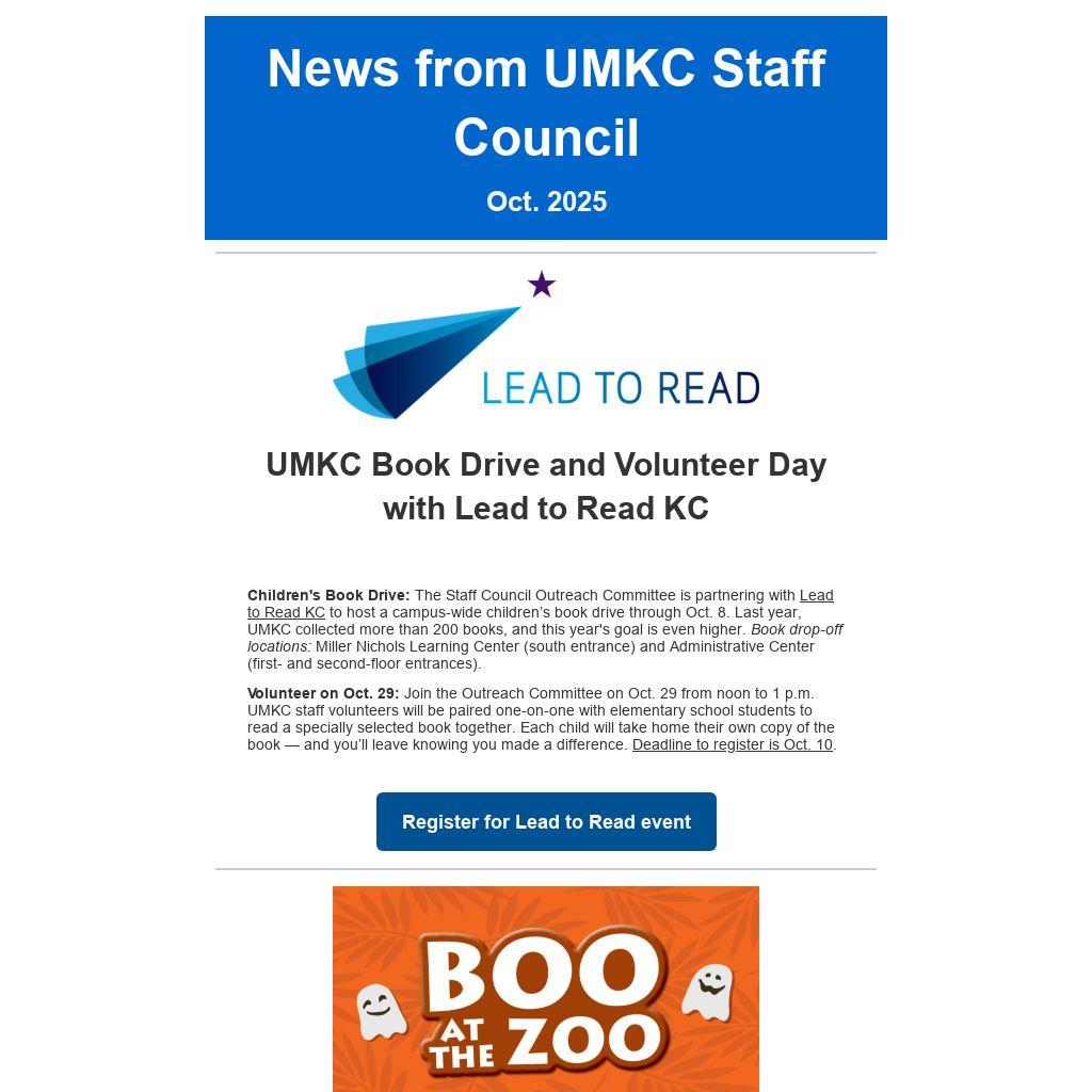 Volunteer on Oct. 29: Join the Outreach Committee on Oct. 29 from noon to 1 p.m. UMKC staff volunteers will be paired one-on-one with elementary school students to read a specially selected book together. Each child will take home their own copy of the book — and you’ll leave knowing you made a difference.
