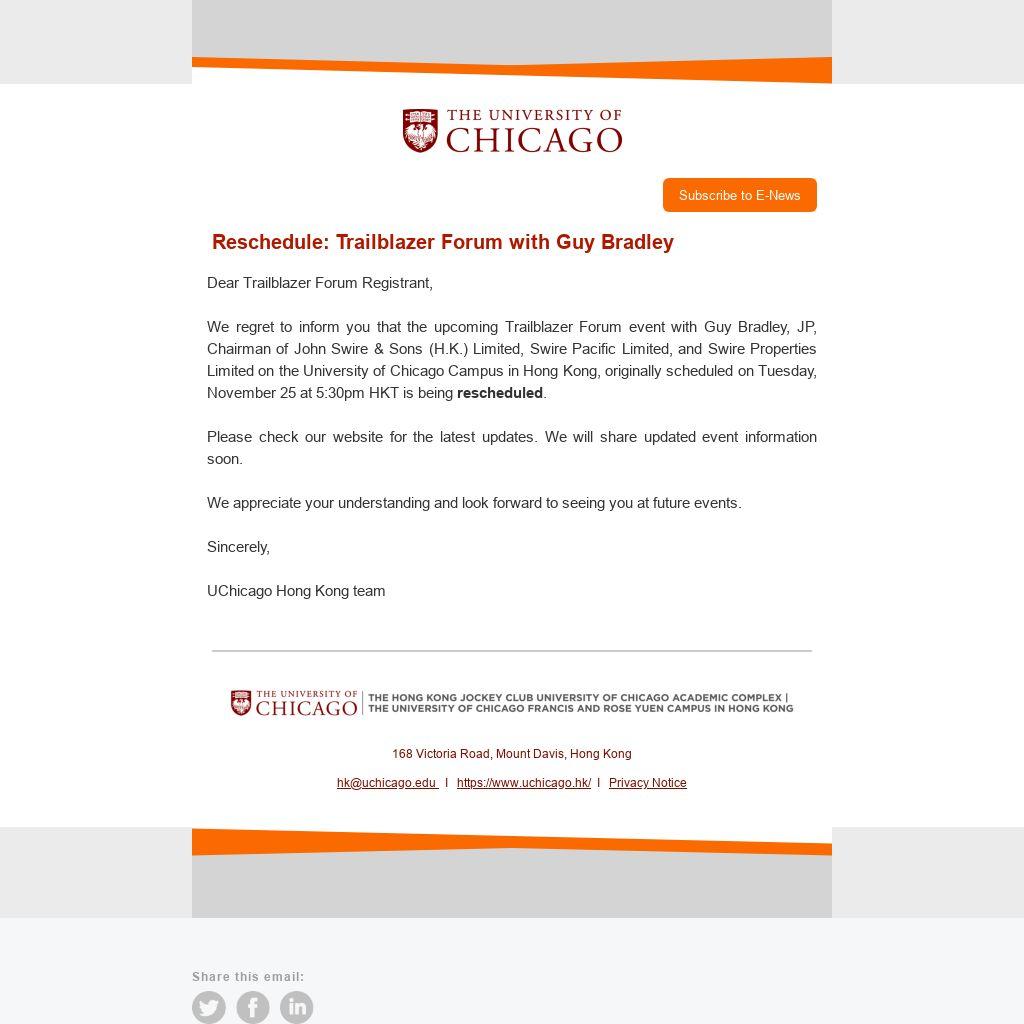 We regret to inform you that the upcoming Trailblazer Forum event with Guy Bradley, JP, Chairman of John Swire & Sons (H.K.) Limited, Swire Pacific Limited, and Swire Properties Limited on the University of Chicago Campus in Hong Kong, originally scheduled on Tuesday, November 25 at 5:30pm HKT is being rescheduled.