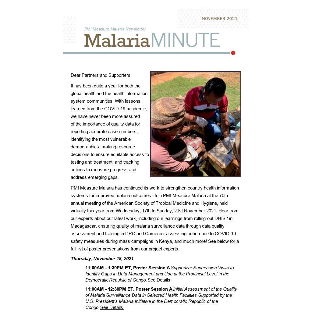 PMI Measure Malaria has continued its work to strengthen country health information systems for improved malaria outcomes. Join PMI Measure Malaria at the 70th annual meeting of the American Society of Tropical Medicine and Hygiene, held virtually this year from Wednesday, 17th to Sunday, 21st November 2021. Hear from our experts about our latest work, including our learnings from rolling-out DHIS2 in Madagascar, ensuring quality of malaria surveillance data through data quality assessment and training in DRC and Cameron, assessing adherence to COVID-19 safety measures during mass campaigns in Kenya, and much more! See below for a full list of poster presentations from our project experts.
