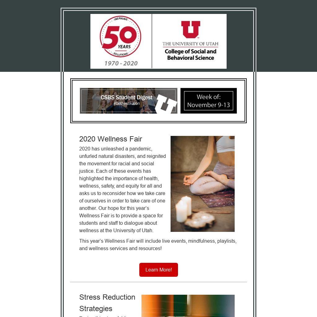 2020 has unleashed a pandemic, unfurled natural disasters, and reignited the movement for racial and social justice. Each of these events has highlighted the importance of health, wellness, safety, and equity for all and asks us to reconsider how we take care of ourselves in order to take care of one another. Our hope for this year’s Wellness Fair is to provide a space for students and staff to dialogue about wellness at the University of Utah.
