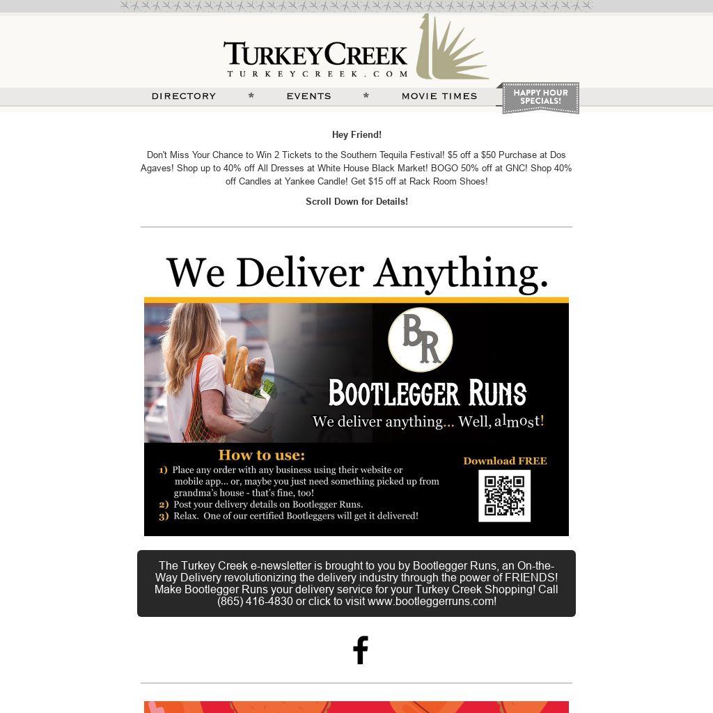 Don't Miss Your Chance to Win 2 Tickets to the Southern Tequila Festival! $5 off a $50 Purchase at Dos Agaves! Shop up to 40% off All Dresses at White House Black Market! BOGO 50% off at GNC! Shop 40% off Candles at Yankee Candle! Get $15 off at Rack Room Shoes!