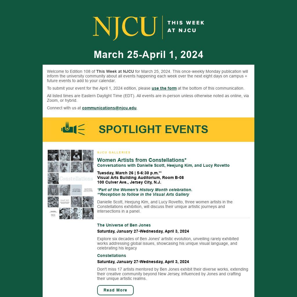 Welcome to Edition 108 of This Week at NJCU for March 25, 2024. This once-weekly Monday publication will inform the university community about all events happening each week over the next eight days on campus + future events to add to your calendar.