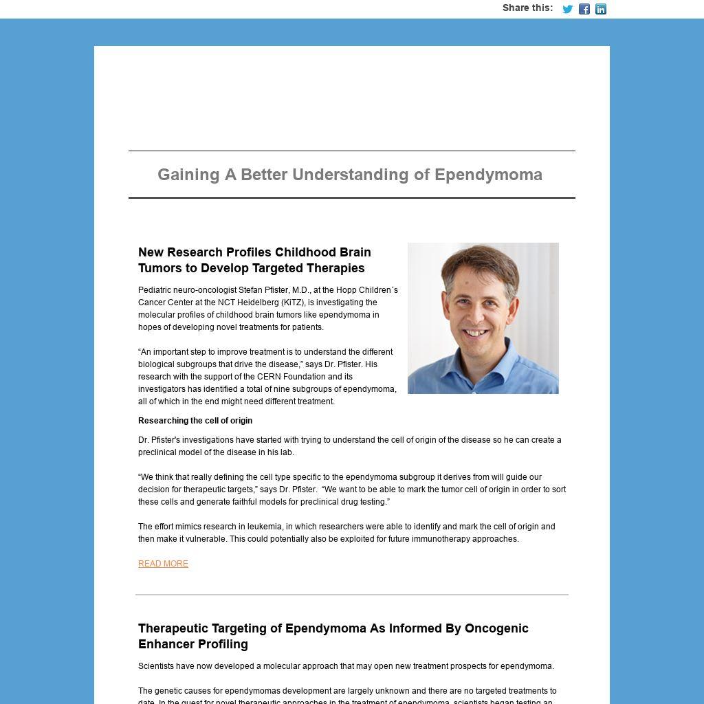 “An important step to improve treatment is to understand the different biological subgroups that drive the disease,” says Dr. Pfister. His research with the support of the CERN Foundation and its investigators has identified a total of nine subgroups of ependymoma, all of which in the end might need different treatment.