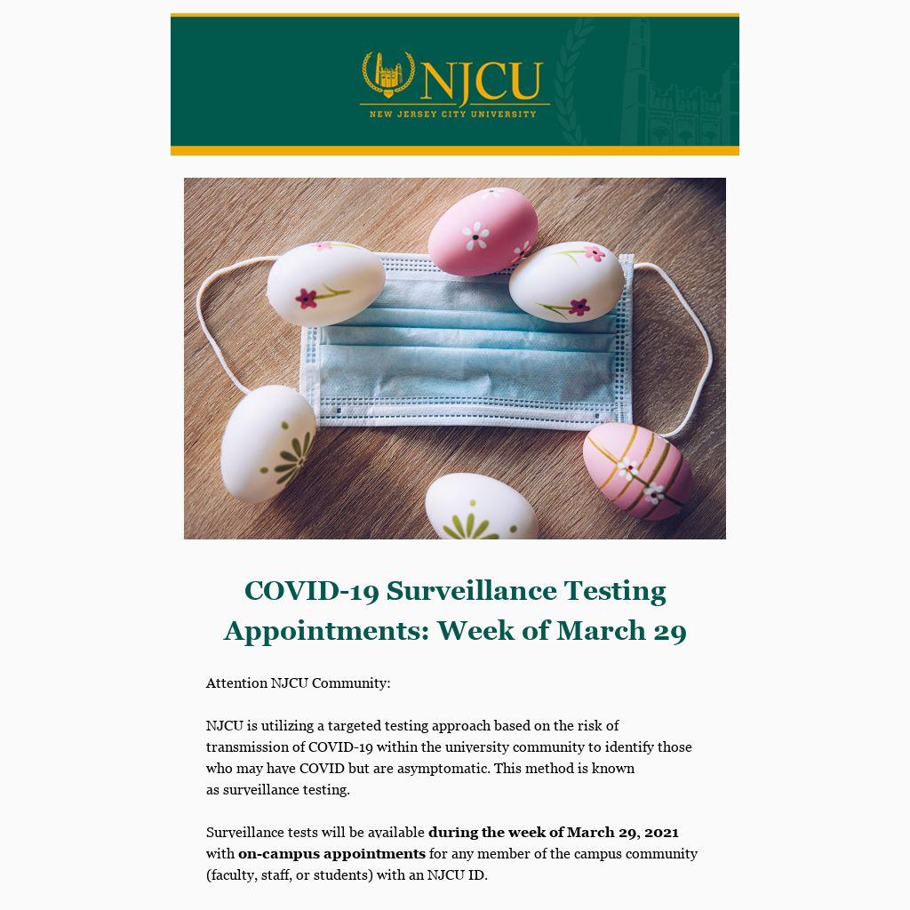 Surveillance tests will be available during the week of March 29, 2021 with on-campus appointments for any member of the campus community (faculty, staff, or students) with an NJCU ID.