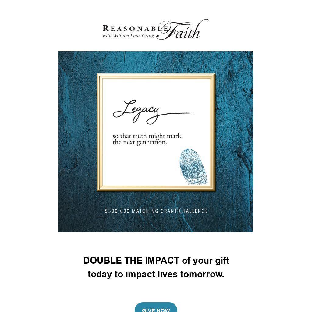 For over twelve years, Christians have looked to Reasonable Faith and the scholarship of Dr. William Lane Craig to equip them in dealing with challenges to their faith. Now, with our annual Matching Grant campaign, every dollar you give from October 15 through December 31 will make twice the impact in presenting a rigorous, thoughtful defense of Christianity both now and in the generations to come.