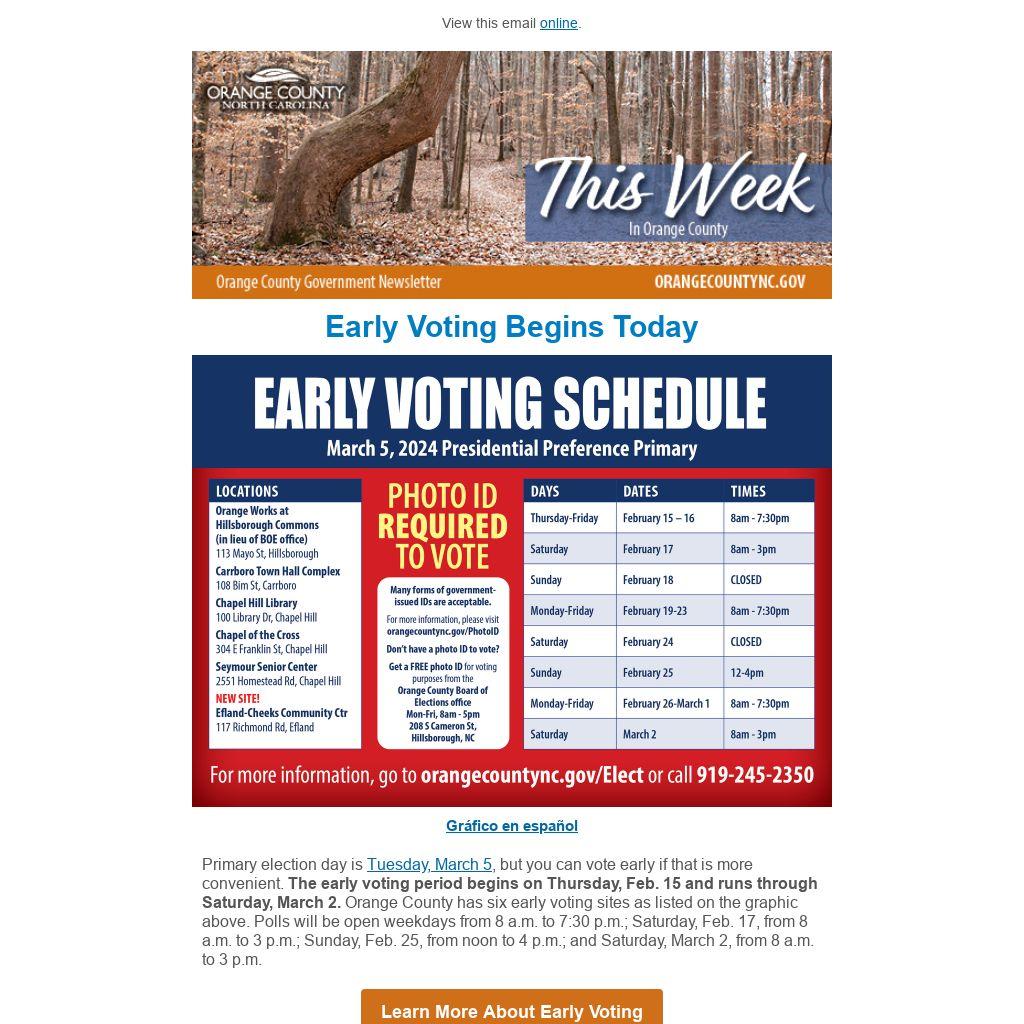 The early voting period begins on Thursday, Feb. 15 and runs through Saturday, March 2. Orange County has six early voting sites as listed on the graphic above. Polls will be open weekdays from 8 a.m. to 7:30 p.m.; Saturday, Feb. 17, from 8 a.m. to 3 p.m.; Sunday, Feb. 25, from noon to 4 p.m.; and Saturday, March 2, from 8 a.m. to 3 p.m.