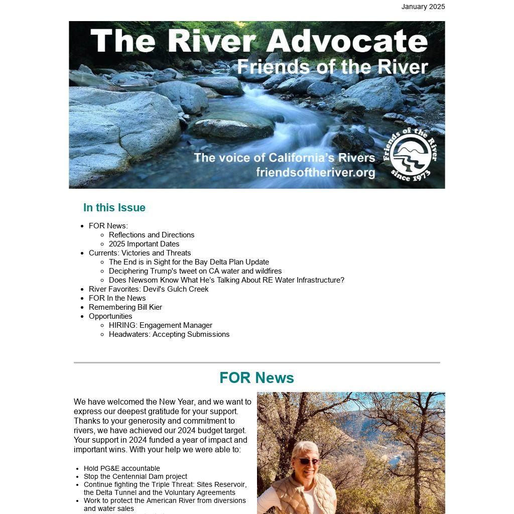 Going forward in 2025, FOR is solidly committed to continue our ongoing priorities of influencing public policy, stopping the Triple Threat, restoring the San Joaquin, protecting the American River, Sacramento River and San Joaquin River tributaries, and more. We will also be growing our ability to inspire citizen action by adding a full-time position to our staff, which will focus on community engagement. Please see the job description below.