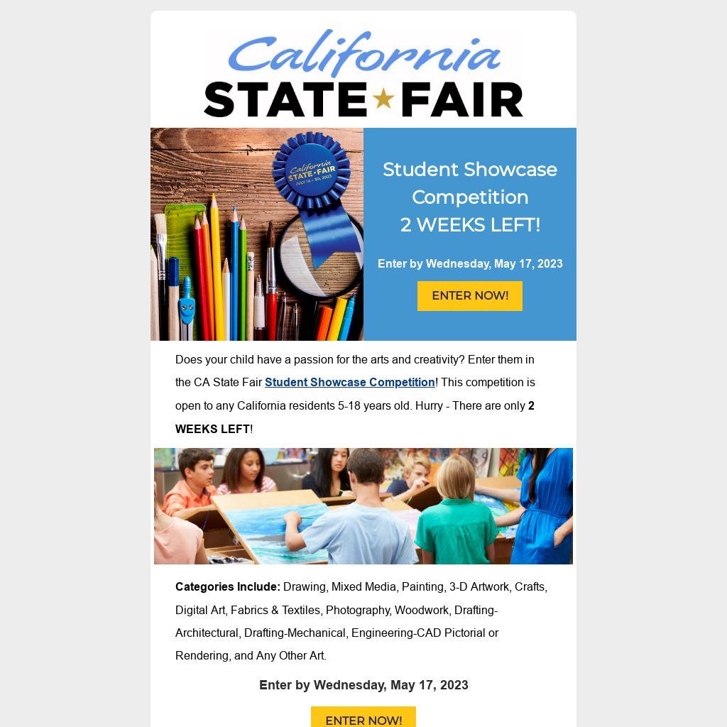 Does your child have a passion for the arts and creativity? Enter them in the CA State Fair Student Showcase Competition! This competition is open to any California residents 5-18 years old. Hurry - There are only 2 WEEKS LEFT!