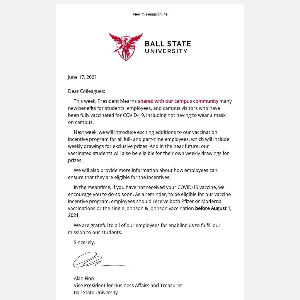 Next week, we will introduce exciting additions to our vaccination incentive program for all full- and part-time employees, which will include weekly drawings for exclusive prizes. And in the near future, our vaccinated students will also be eligible for their own weekly drawings for prizes.