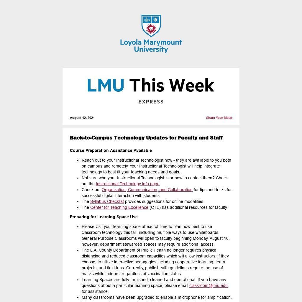 Back-to-Campus Technology Updates As LMU's campuses return to on-site instruction in the fall 2021 semester, Information Technology Services provides essential information and recommendations to help make the transition as seamless as possible.