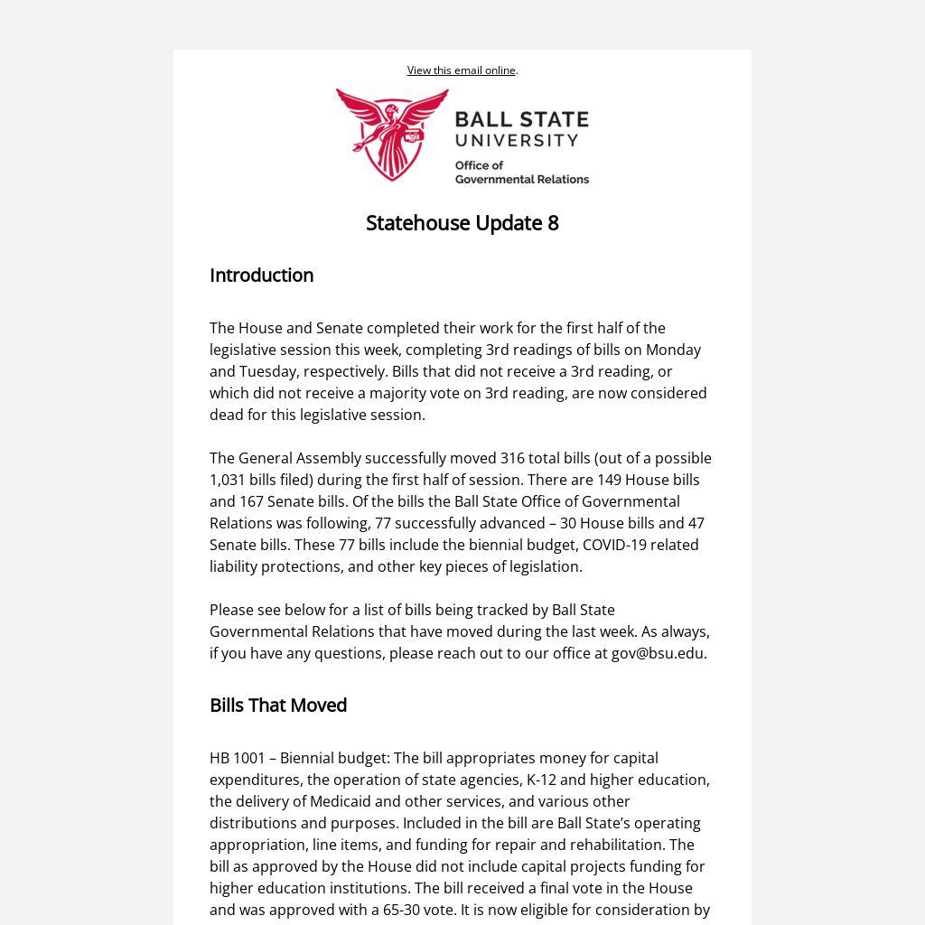 The General Assembly successfully moved 316 total bills (out of a possible 1,031 bills filed) during the first half of session. There are 149 House bills and 167 Senate bills. Of the bills the Ball State Office of Governmental Relations was following, 77 successfully advanced – 30 House bills and 47 Senate bills. These 77 bills include the biennial budget, COVID-19 related liability protections, and other key pieces of legislation.