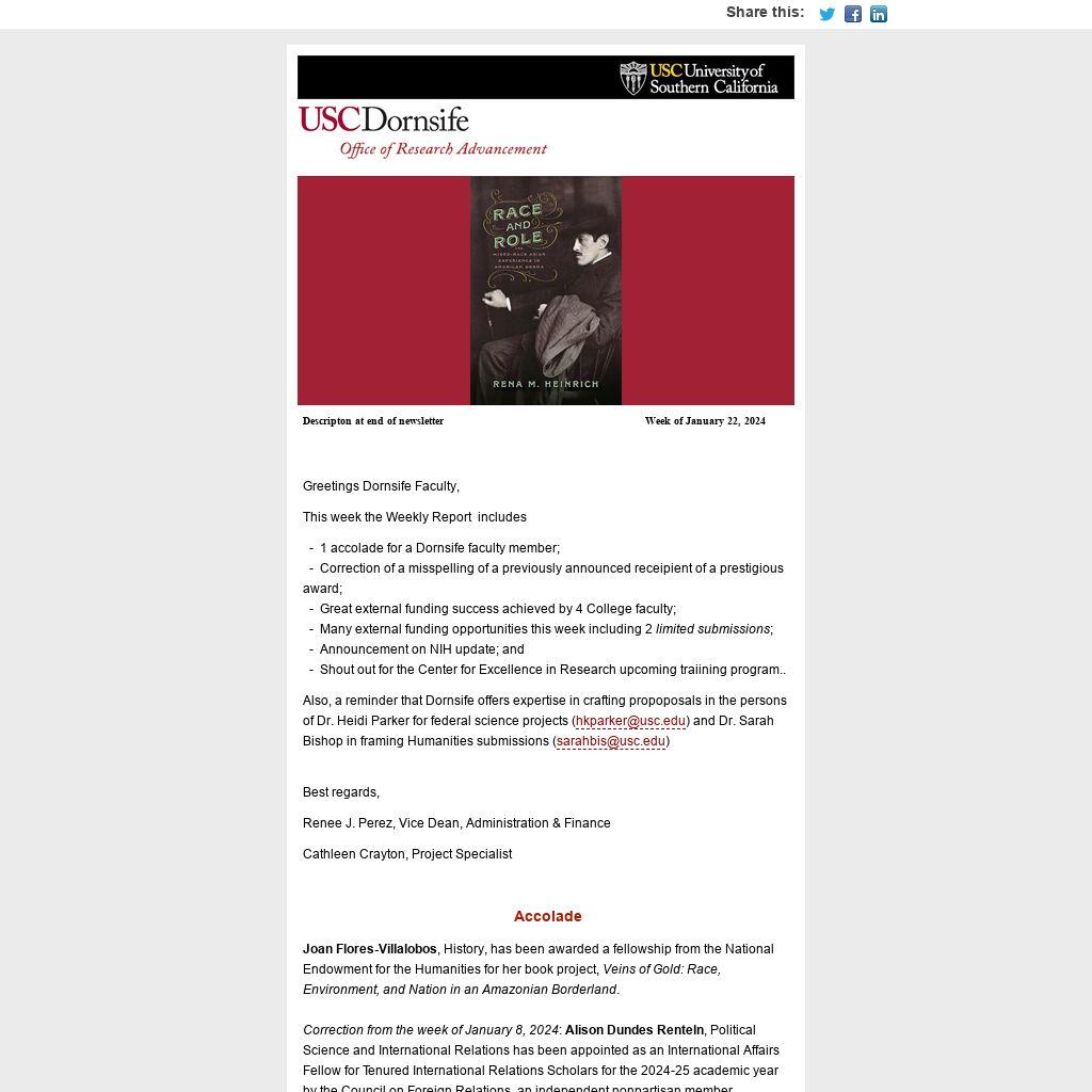 - 1 accolade for a Dornsife faculty member; - Correction of a misspelling of a previously announced receipient of a prestigious award; - Great external funding success achieved by 4 College faculty; - Many external funding opportunities this week including 2 limited submissions; - Announcement on NIH update; and - Shout out for the Center for Excellence in Research upcoming traiining program..
