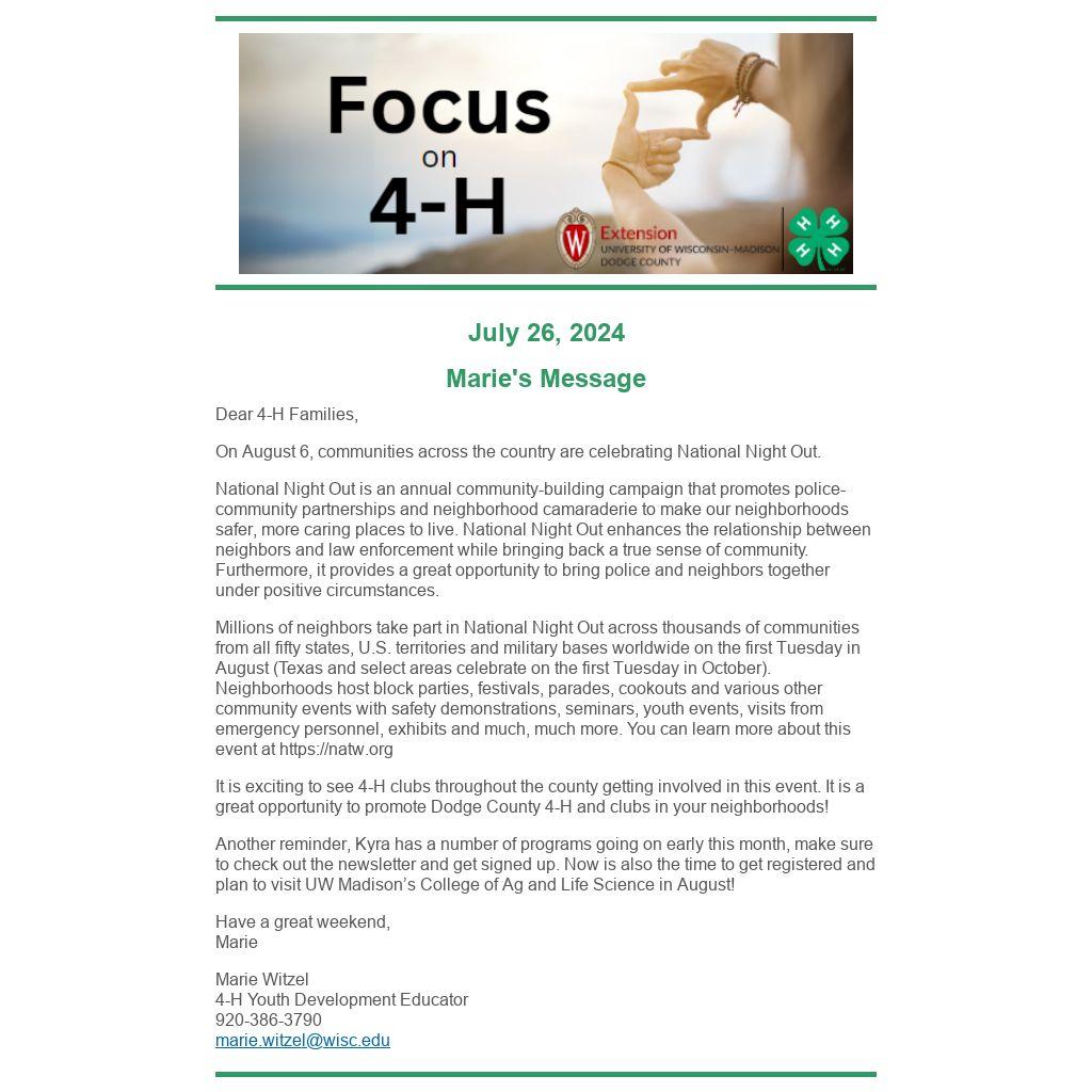 If you have Secretary's Minutes to share, please send them to the 4-H / Youth Program Assistant, Terra at: treider@wisc.edu by noon on Wednesday to be included in that week's issue. You can also contact the office with any questions. Thanks!