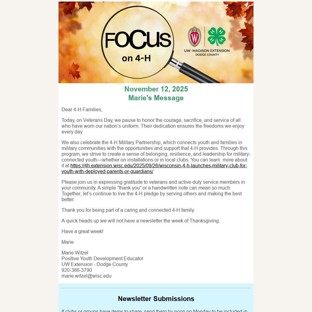 We also celebrate the 4-H Military Partnership, which connects youth and families in military communities with the opportunities and support that 4-H provides. Through this program, we strive to create a sense of belonging, resilience, and leadership for military-connected youth—whether on installations or in local clubs. You can learn more about it at https://4h.extension.wisc.edu/2025/09/26/wisconsin-4-h-launches-military-club-for-youth-with-deployed-parents-or-guardians/