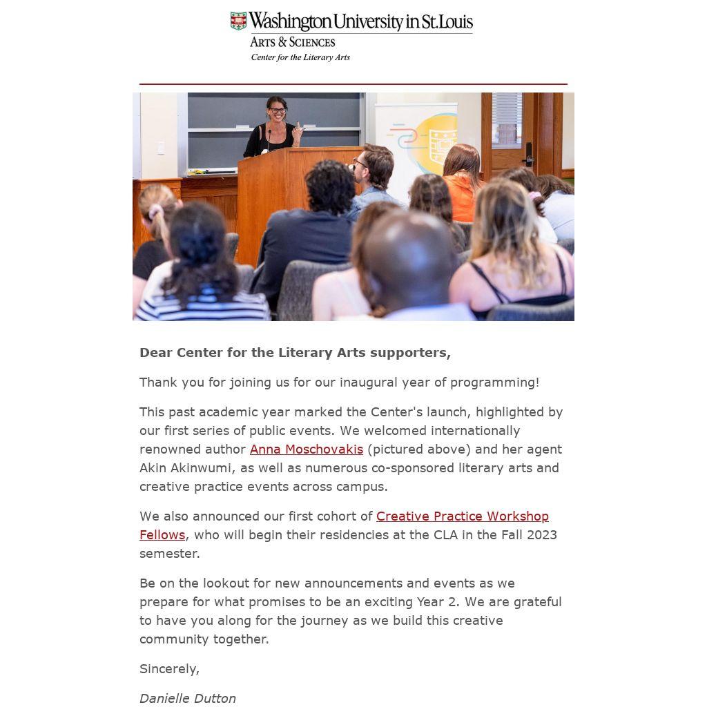 This past academic year marked the Center's launch, highlighted by our first series of public events. We welcomed internationally renowned author Anna Moschovakis (pictured above) and her agent Akin Akinwumi, as well as numerous co-sponsored literary arts and creative practice events across campus.