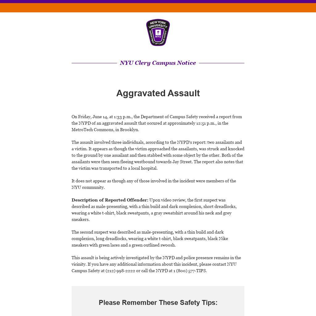 On Friday, June 14, at 1:33 p.m., the Department of Campus Safety received a report from the NYPD of an aggravated assault that occured at approximately 12:51 p.m., in the MetroTech Commons, in Brooklyn.