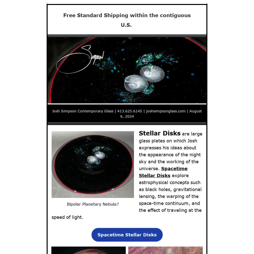 Stellar Disks are large glass plates on which Josh expresses his ideas about the appearance of the night sky and the working of the universe. Spacetime Stellar Disks explore astrophysical concepts such as black holes, gravitational lensing, the warping of the space-time continuum, and the effect of traveling at the speed of light.