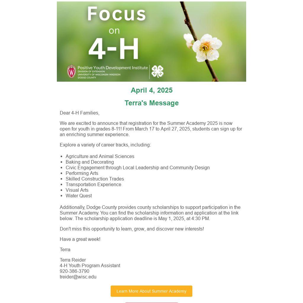 Check your email on Wednesday, April 9th for the next Focus on 4-H!