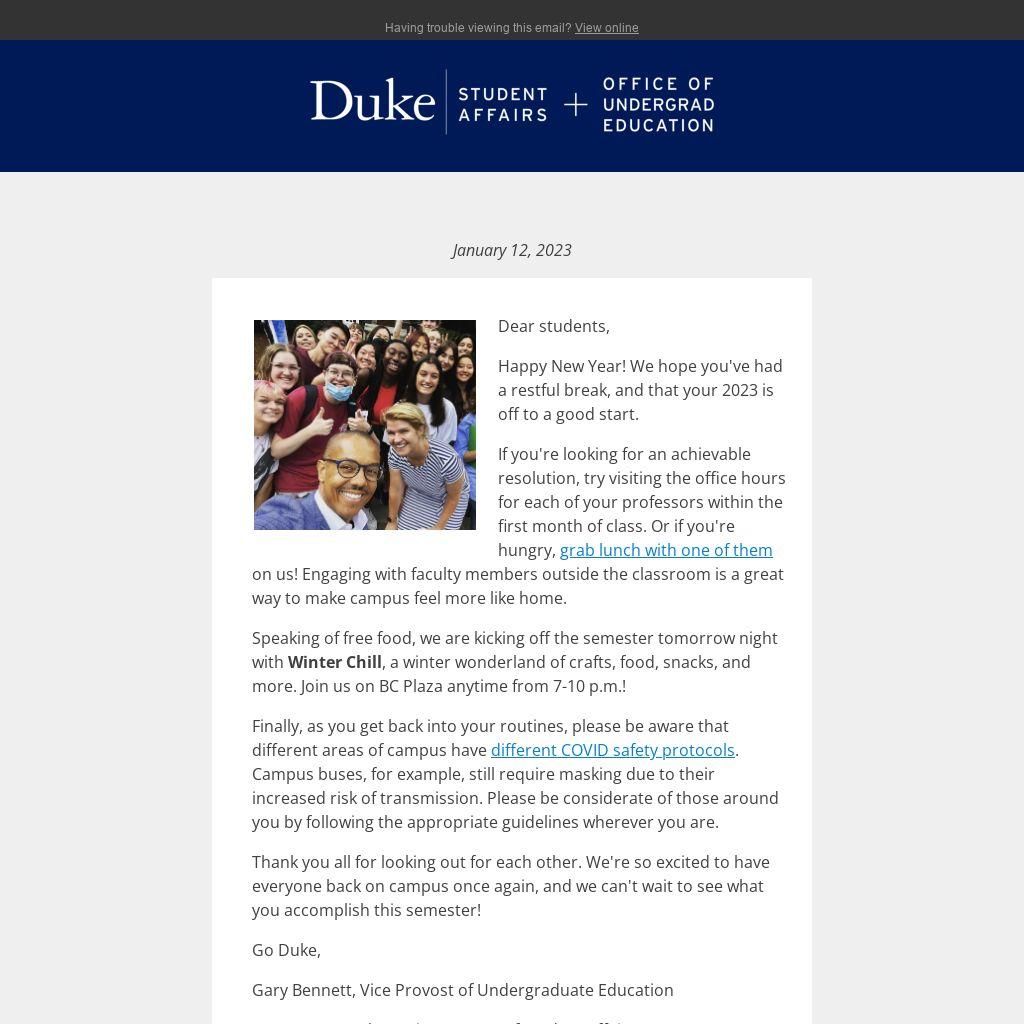 Thank you all for looking out for each other. We're so excited to have everyone back on campus once again, and we can't wait to see what you accomplish this semester!