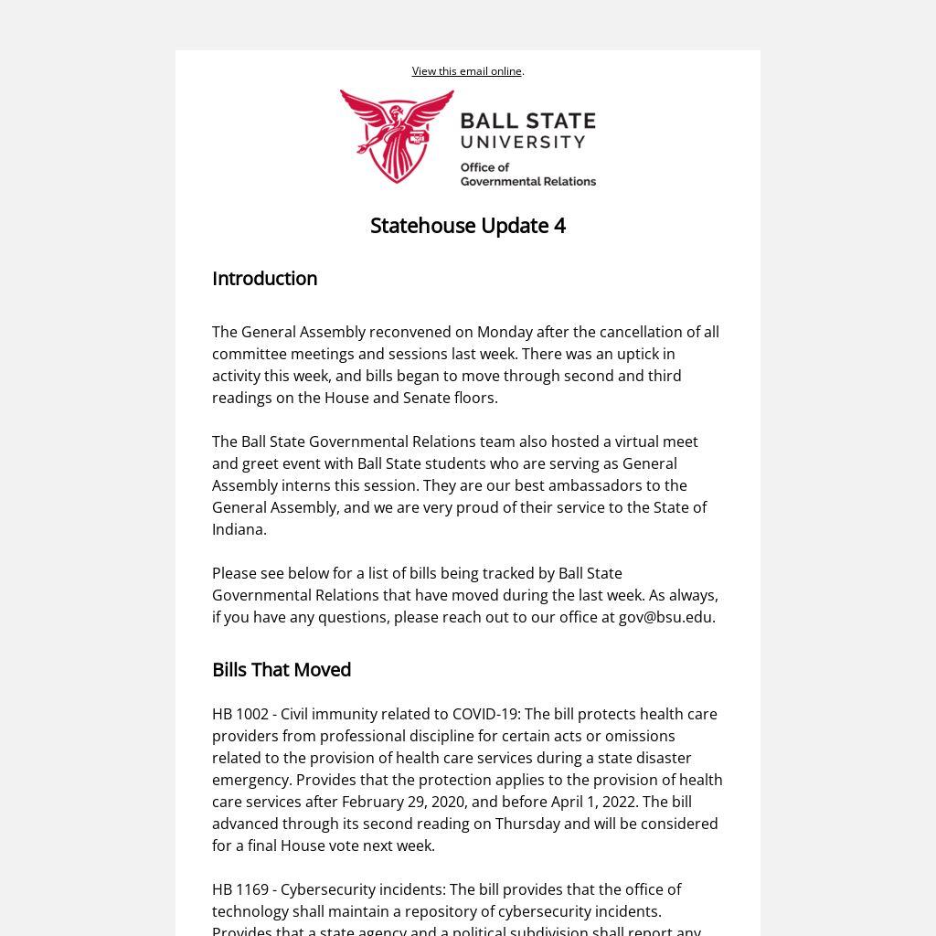 Please see below for a list of bills being tracked by Ball State Governmental Relations that have moved during the last week. As always, if you have any questions, please reach out to our office at gov@bsu.edu.