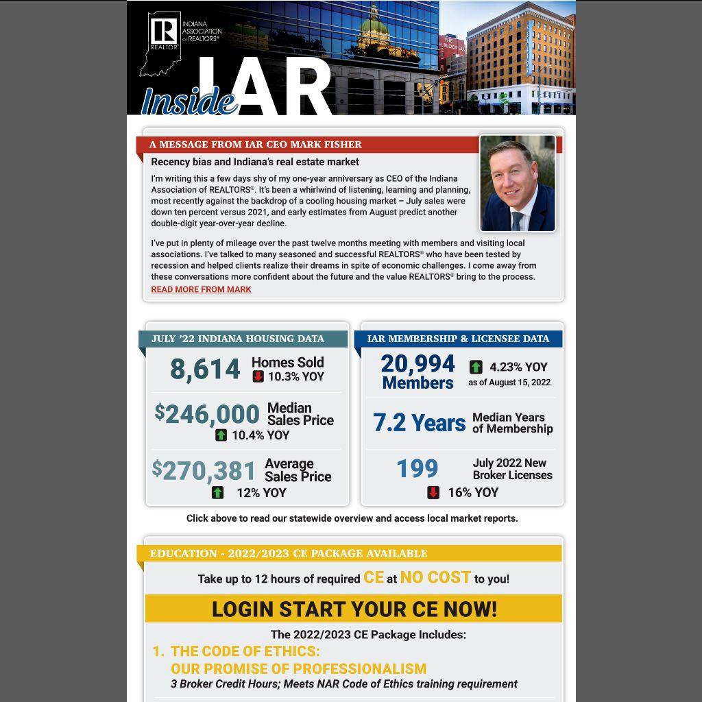 Inside IAR. This monthly newsletter is an activity report from your state association. It’s for our leaders (board members, committee members, past presidents) and the leaders (presidents, presidents-elect) and staff at our local associations. We want to empower you with information and open the lines of communication. The goal is to form more partnerships so the REALTOR® organization is the strongest it can be in Indiana. Thank you for reading and thank you for the time and talent you give to the real estate industry.