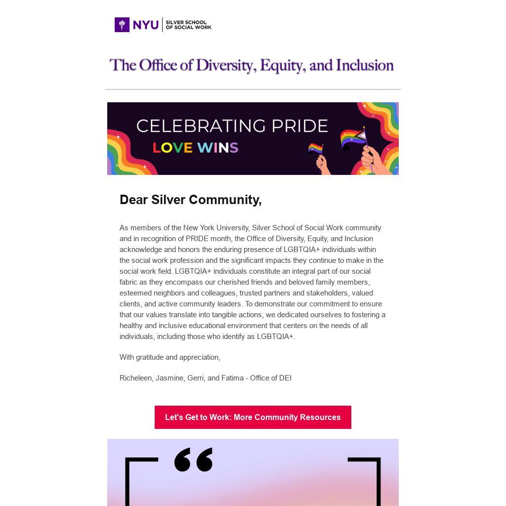 As members of the New York University, Silver School of Social Work community and in recognition of PRIDE month, the Office of Diversity, Equity, and Inclusion acknowledge and honors the enduring presence of LGBTQIA+ individuals within the social work profession and the significant impacts they continue to make in the social work field. LGBTQIA+ individuals constitute an integral part of our social fabric as they encompass our cherished friends and beloved family members, esteemed neighbors and colleagues, trusted partners and stakeholders, valued clients, and active community leaders. To demonstrate our commitment to ensure that our values translate into tangible actions, we dedicated ourselves to fostering a healthy and inclusive educational environment that centers on the needs of all individuals, including those who identify as LGBTQIA+.
