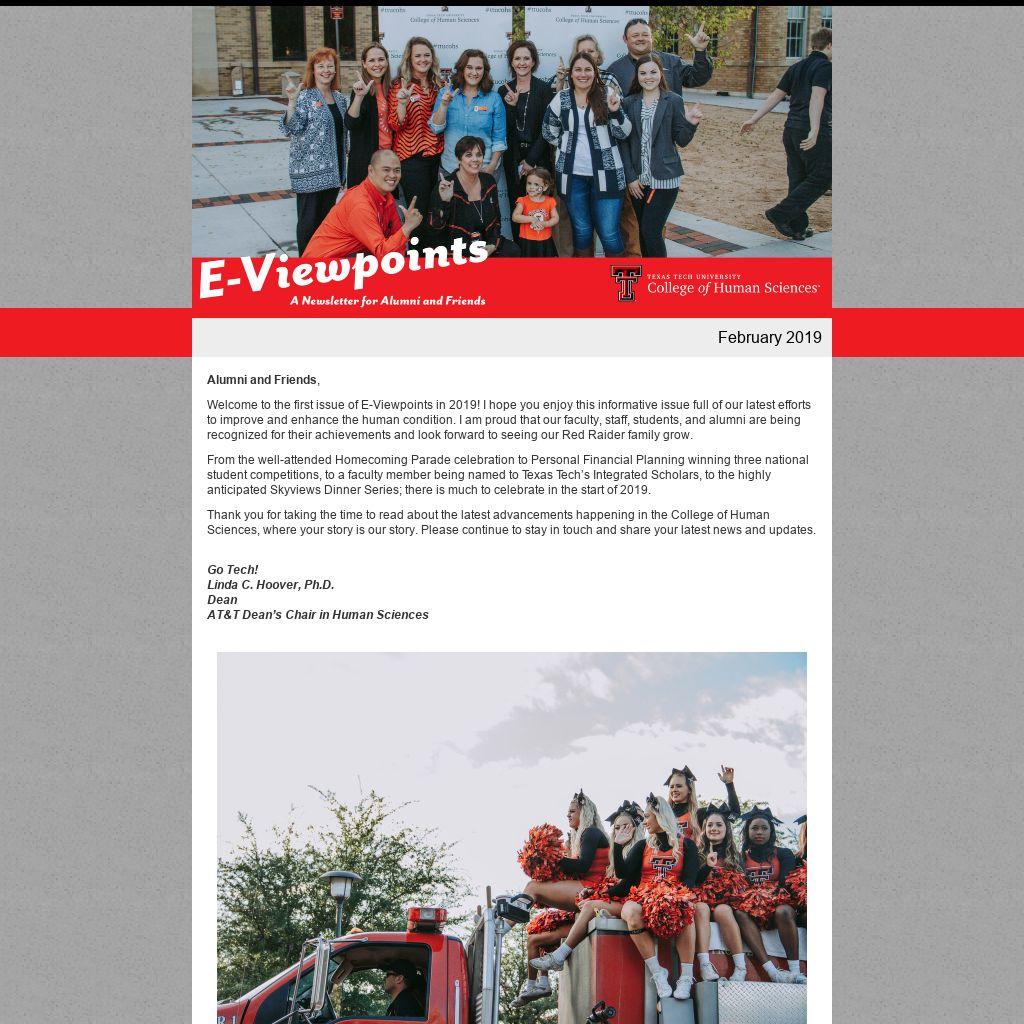 | Alumni and Friends, Welcome to the first issue of E-Viewpoints in 2019! I hope you enjoy this informative issue full of our latest efforts to improve and enhance the human condition. I am proud that our faculty, staff, students, and alumni are being recognized for their achievements and look forward to seeing our Red Raider family grow.