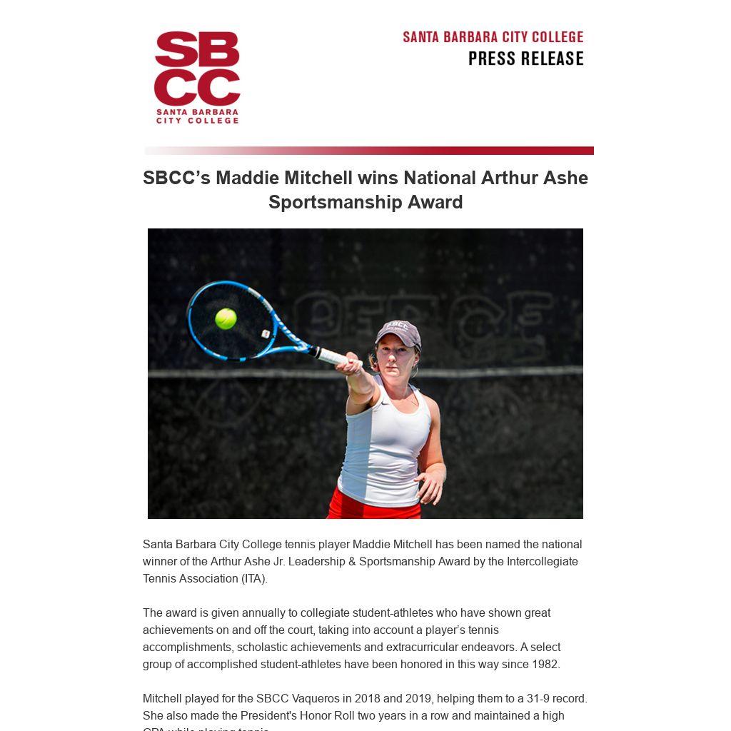 Santa Barbara City College tennis player Maddie Mitchell has been named the national winner of the Arthur Ashe Jr. Leadership & Sportsmanship Award by the Intercollegiate Tennis Association (ITA).