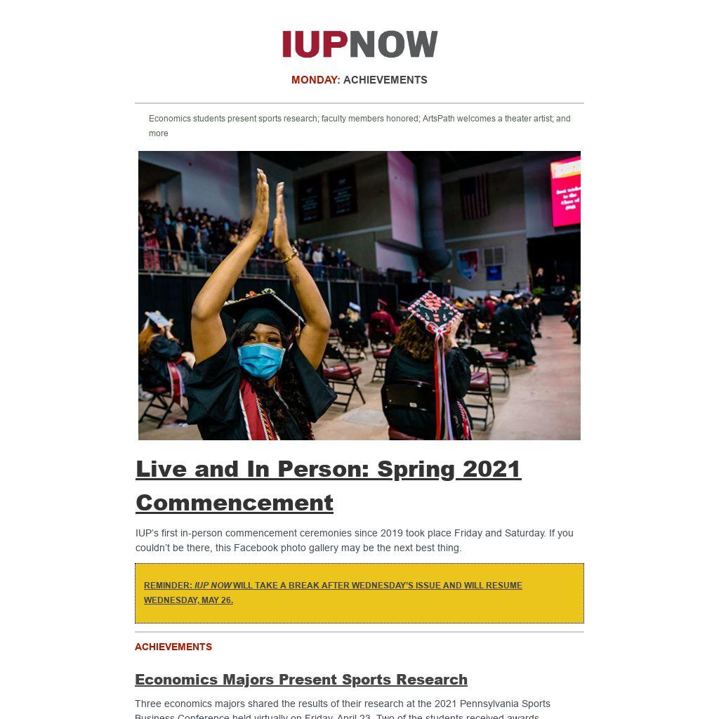 Distributed to IUP employees and students four days a week, IUP Now is the official newsletter of Indiana University of Pennsylvania. It features news from across the IUP website, compiled by the Division of Marketing and Communications. Find out how to get your news and events in IUP Now.
