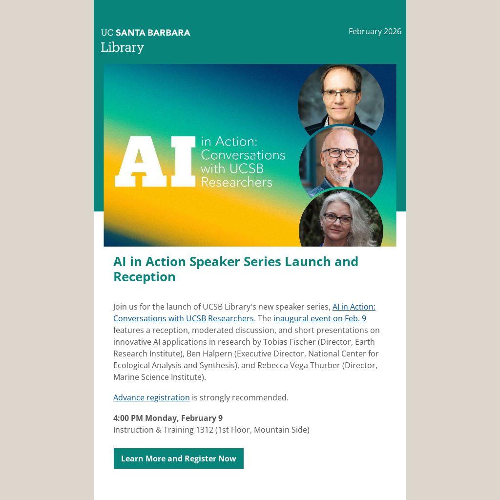 Join us for the launch of UCSB Library's new speaker series, AI in Action: Conversations with UCSB Researchers. The inaugural event on Feb. 9 features a reception, moderated discussion, and short presentations on innovative AI applications in research by Tobias Fischer (Director, Earth Research Institute), Ben Halpern (Executive Director, National Center for Ecological Analysis and Synthesis), and Rebecca Vega Thurber (Director, Marine Science Institute).