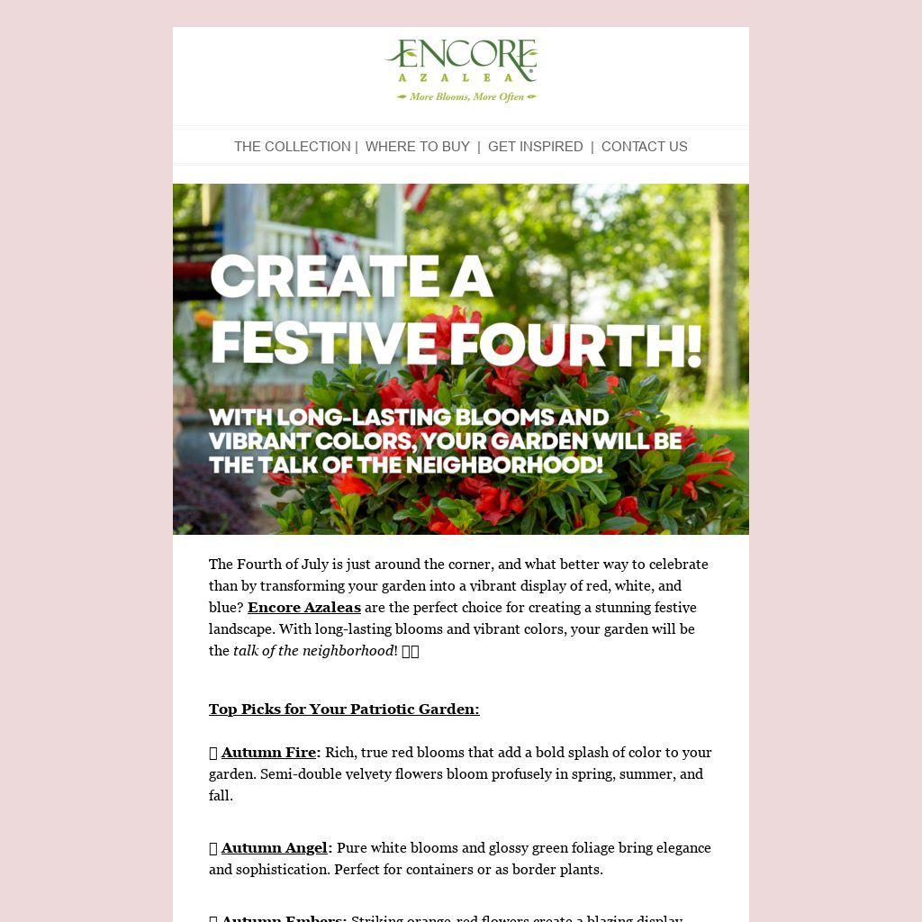Get ready to celebrate in style with a garden full of vibrant, festive blooms. Transform your outdoor space into a patriotic paradise with Encore Azaleas and make this Fourth of July one to remember!