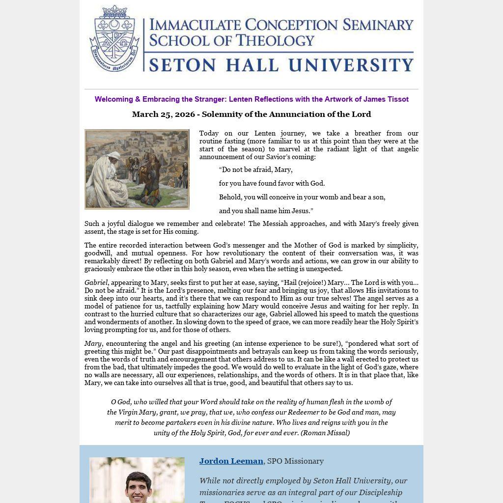 Gabriel, appearing to Mary, seeks first to put her at ease, saying, “Hail (rejoice!) Mary... The Lord is with you… Do not be afraid.” It is the Lord’s presence, melting our fear and bringing us joy, that allows His invitations to sink deep into our hearts, and it’s there that we can respond to Him as our true selves! The angel serves as a model of patience for us, tactfully explaining how Mary would conceive Jesus and waiting for her reply. In contrast to the hurried culture that so characterizes our age, Gabriel allowed his speed to match the questions and wonderments of another. In slowing down to the speed of grace, we can more readily hear the Holy Spirit’s loving prompting for us, and for those of others.