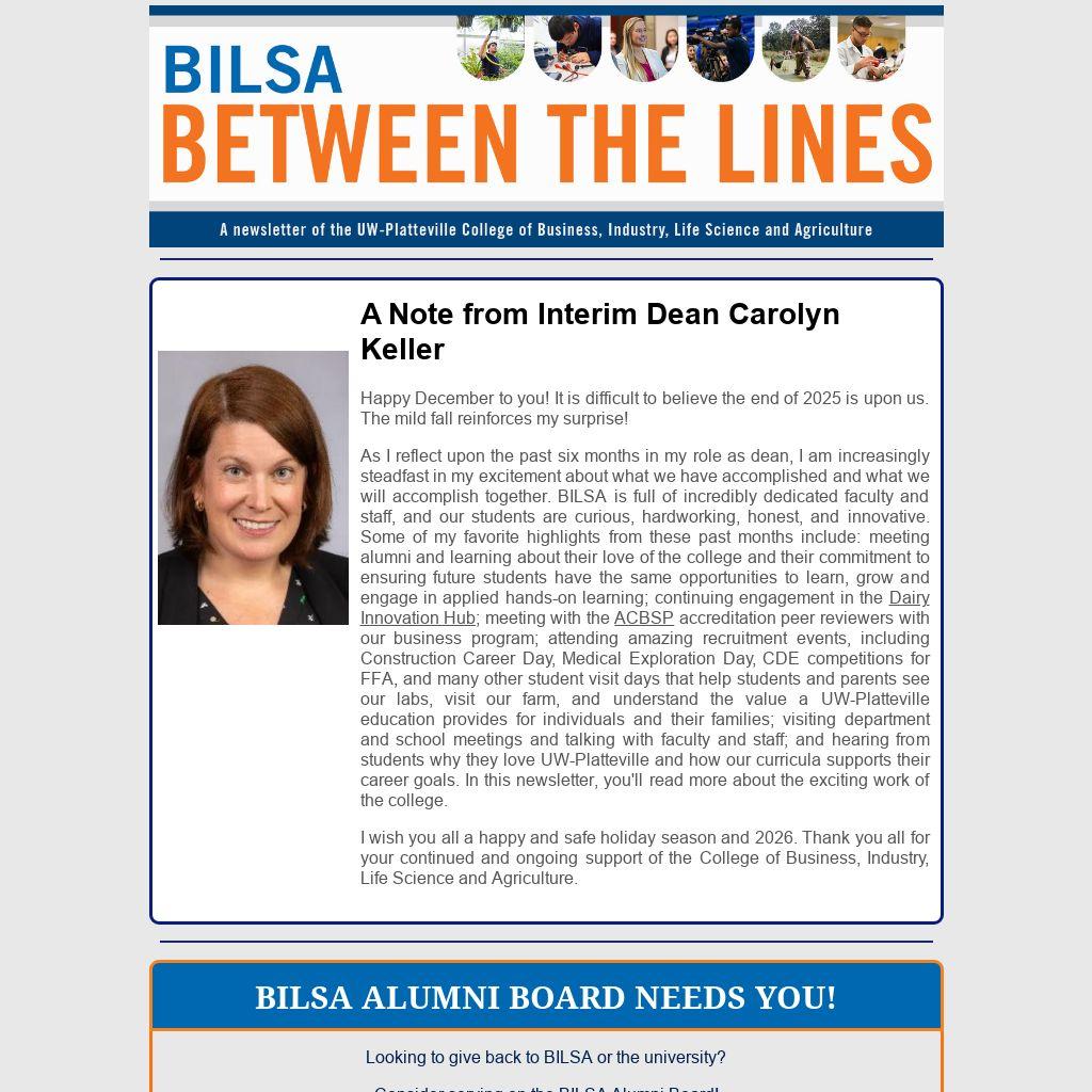 As I reflect upon the past six months in my role as dean, I am increasingly steadfast in my excitement about what we have accomplished and what we will accomplish together. BILSA is full of incredibly dedicated faculty and staff, and our students are curious, hardworking, honest, and innovative. Some of my favorite highlights from these past months include: meeting alumni and learning about their love of the college and their commitment to ensuring future students have the same opportunities to learn, grow and engage in applied hands-on learning; continuing engagement in the Dairy Innovation Hub; meeting with the ACBSP accreditation peer reviewers with our business program; attending amazing recruitment events, including Construction Career Day, Medical Exploration Day, CDE competitions for FFA, and many other student visit days that help students and parents see our labs, visit our farm, and understand the value a UW-Platteville education provides for individuals and their families; visiting department and school meetings and talking with faculty and staff; and hearing from students why they love UW-Platteville and how our curricula supports their career goals. In this newsletter, you'll read more about the exciting work of the college.