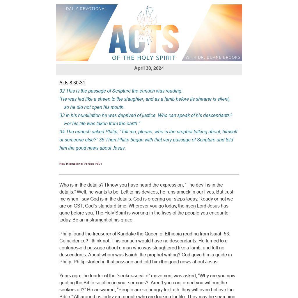 Who is in the details? I know you have heard the expression, “The devil is in the details.” Well, he wants to be. Left to his devices, he runs amuck in our lives. But trust me when I say God is in the details. God is ordering our steps today. Ready or not we are on GST, God’s standard time. Wherever you go today, the risen Lord Jesus has gone before you. The Holy Spirit is working in the lives of the people you encounter today. Be an instrument of his grace.