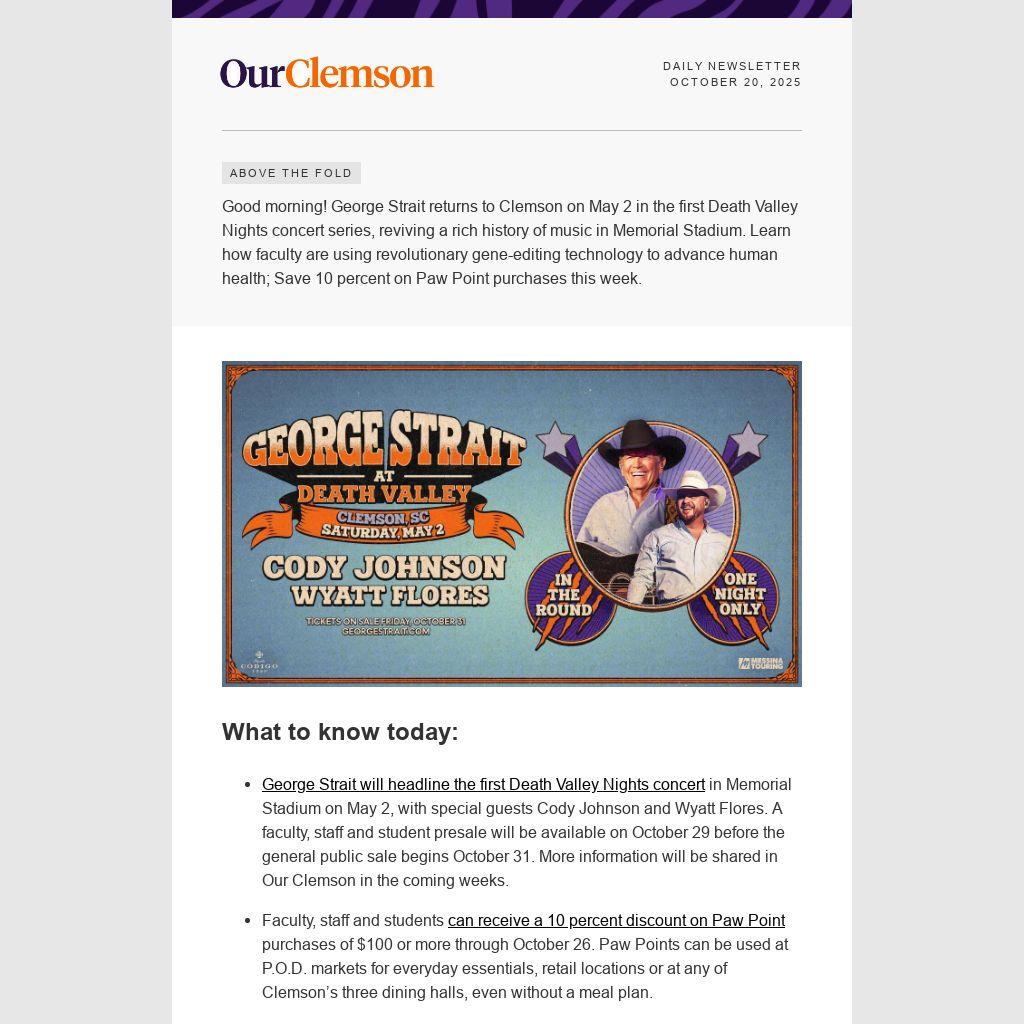 Good morning! George Strait returns to Clemson on May 2 in the first Death Valley Nights concert series, reviving a rich history of music in Memorial Stadium. Learn how faculty are using revolutionary gene-editing technology to advance human health; Save 10 percent on Paw Point purchases this week.