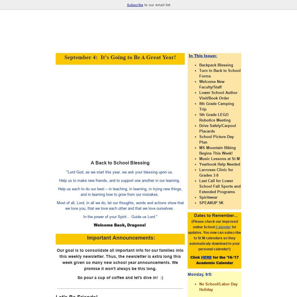 | Dates to Remember...(Please check our improved online School Calendar for updates. You now can subscribe to St M calendars so they automaticaly download to your personal calendar!) Click HERE for the '16-'17 Academic Calendar