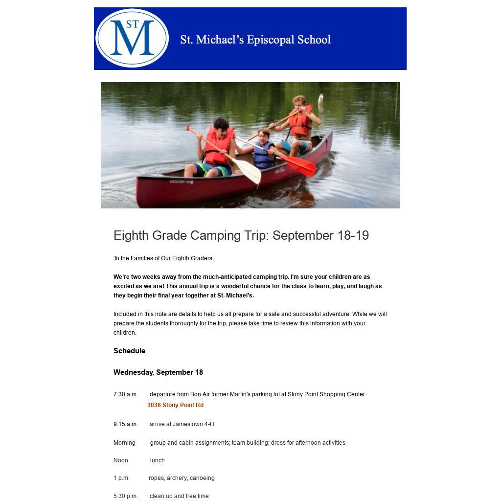 We’re two weeks away from the much-anticipated camping trip. I’m sure your children are as excited as we are! This annual trip is a wonderful chance for the class to learn, play, and laugh as they begin their final year together at St. Michael’s.